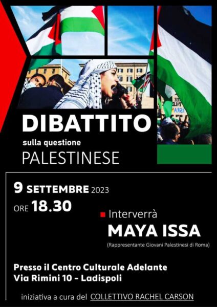 Sabato 9 settembre alle ore 18.30 in via Rimini 10, presso lo spazio Adelante, si terrà il dibattito sulla questione palestinese promosso dal Collettivo culturale Rachel Carson.