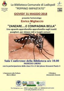 Giovedì 31 maggio, ore 10.00, la conferenza a cura dell’entomologo Enrico Migliaccio: “ZANZARE e….COMPAGNIA BELLA : uno sguardo approfondito sugli insetti pungitori per sfatare miti e luoghi comuni” , un argomento attuale che ha funestato le vacanze di molti, la scorsa estate, trattato con grande approssimazione e superficialità dalla stampa in generale, facendo una grande confusione tra virus e protozoi, tra agenti eziologici e vettori. Con questa conferenza si cerca di fare chiarezza, sottolineando inoltre il grande contributo dato dai ricercatori italiani nelle lotta alla malaria. All’incontro, aperto a tutti i cittadini, parteciperanno anche i bambini delle classi IV e V del Plesso scolastico “Giovanni Paolo II”.