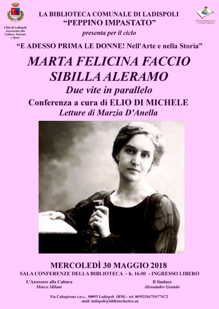 Mercoledì 30 maggio, ore 16.00, la conferenza “MARTA FELICINA FACCIO – SIBILLA ALERAMO: DUE VITE IN PARALLELO”, a cura di Elio Di Michele, con letture di Marzia D’Anella, a chiusura del fortunato ciclo “E ADESSO PRIMA LE DONNE! Nell’Arte e nella Storia”.