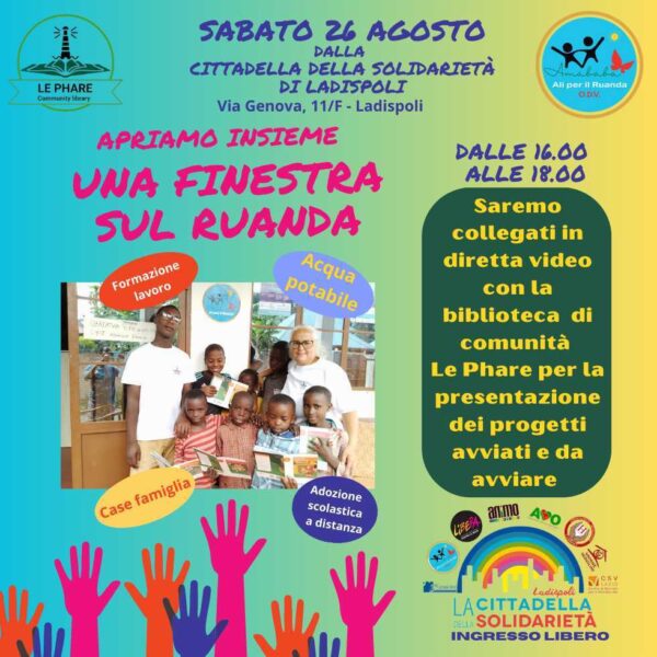 Sabato 26 Agosto, alle 16.30 ci collegheremo dalla Cittadella della Solidarietà in video con la biblioteca che gestiamo in Ruanda, dove sarà in corso la Summer Fest, le immagini del collegamento saranno visibili su schermo.