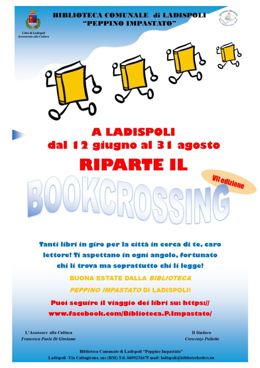 è arrivata l’estate e il BOOKCROSSING bussa alle porte! La Biblioteca Comunale “Peppino Impastato” di Ladispoli informa che dal prossimo 12 giugno e fino al 31 agosto, con cadenza settimanale, saranno liberati nei luoghi pubblici della città oltre 100 libri per grandi e bambini. Leggeteli e poi rimetteteli in libertà per chi dopo di voi avrà la fortuna di incontrarli. Tutti potranno seguirne le tracce visitando la pagina facebook della Biblioteca all’indirizzo https://www.facebook.com/Biblioteca.P.Impastato/ .