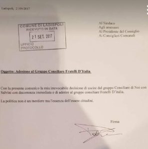 Al fine di far chiarezza sulla tardiva espulsione comunicata dal Quintavalle arrivata solo alle ore 12.30 circa, invito tutte le parti politiche e i cittadini a prendere atto che, stamane alle ore 10.30 c.a. ho protocollato e ufficializzato la mia irrevocabile decisione di Lasciare, a malincuore, il gruppo Ncs aderendo a F.lli D’italia. Ma vorrei fare maggiore chiarezza esternando a tutti gli step che ho percorso in questi giorni. In data 18 settembre ho comunicato verbalmente, de visu, al capogruppo di Fratelli D’Italia, la mia determinazione ad entrare nel suo gruppo consiliare. Avendo avuto disponibilità, la stessa sera, durante la riunione di Maggioranza tenutasi nella sede di Viale italia, 94 ho verbalmente dichiarato al Sindaco, alla giunta e a tutti i consiglieri presenti, la mia immediata volontà di Lasciare Ncs per essere accolto in Fratelli D’Italia.