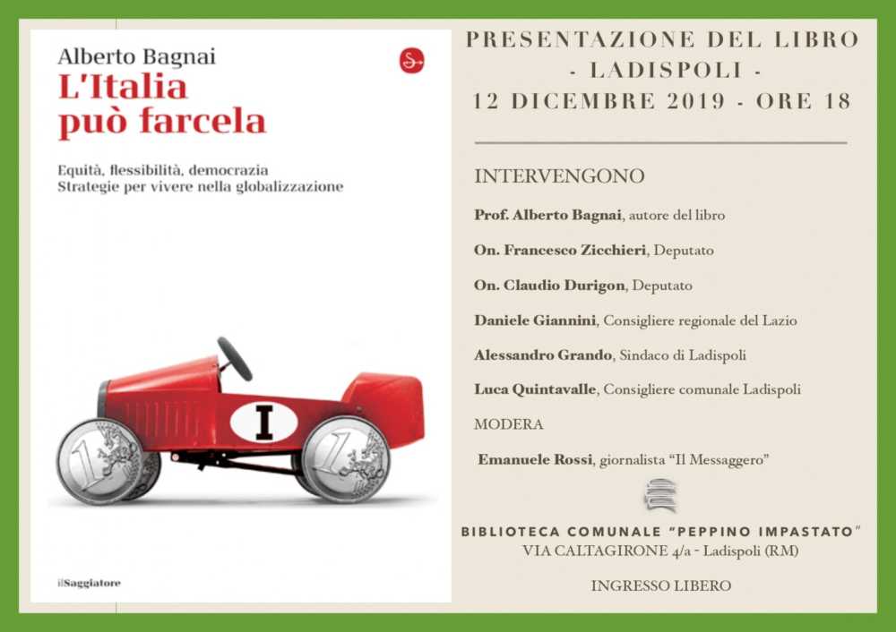 Appuntamento importante questo di giovedì 12 dicembre : abbiamo la fortuna di ospitare , nella sala convegni della Biblioteca Comunale “Peppino Impastato” in via Caltagirone, 4/a, il professor Alberto Bagnai. Economista, musicista, parlamentare, accademico e scrittore: personalità importante e uomo di cultura, il professor Bagnai ci parlerà del suo libro “L’Italia può farcela”.