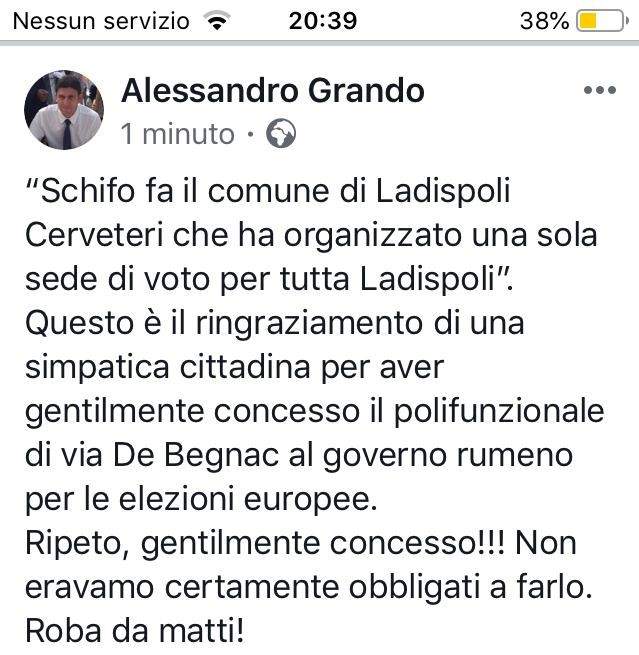 Questo quanto scritto da Grando: “Schifo fa il comune di Ladispoli/Cerveteri che ha organizzato una sola sede di voto per tutta Ladispoli”.