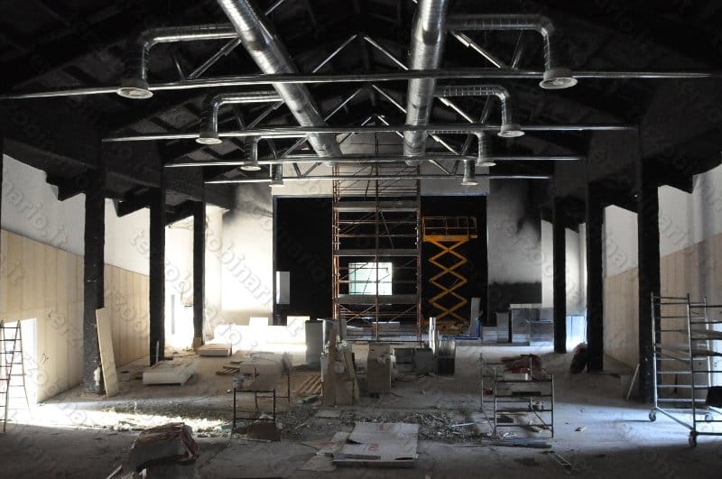 I lavori procedono rapidamente, anche più del previsto, e per ottobre potrebbe essere terminata la struttura esterna. L’auditorium ospiterà quasi 400 persone. Come si vede dalle foto sarà dotato di camerini, cabina di regia, spazio per le prove retrostante il palcoscenico, e un atrio di ingresso ampio e accogliente. Che però non sarà definitivo, in quanto è previsto un ampliamento dei lavori per le altre quattro campate del vecchio edificio rimaste escluse dai lavori in attesa di futuri ulteriori fondi. In quello spazio ci sarà il vero e proprio foyer, con tanto di atrio per le esposizioni e caffetteria.