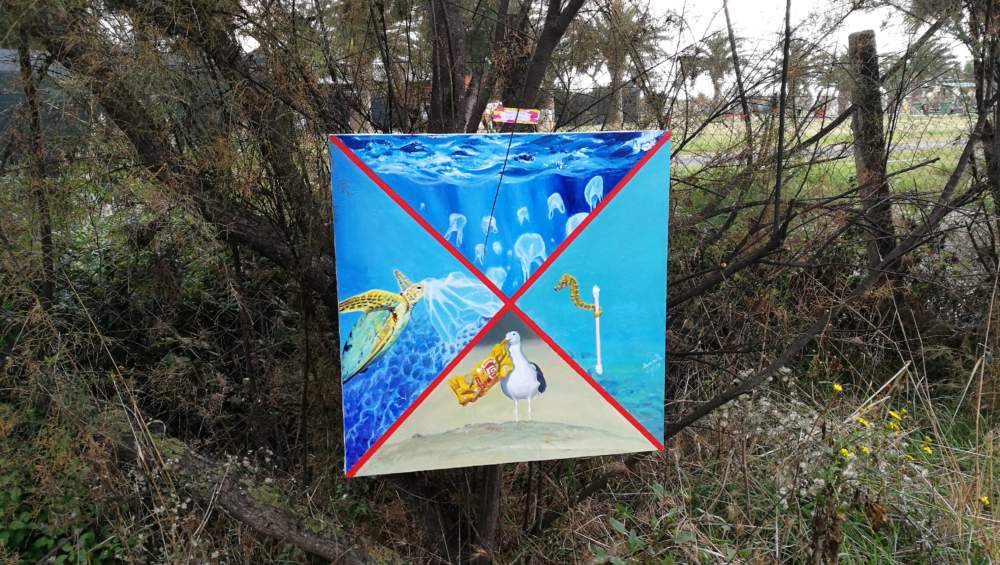 Diceva Beryl Markham “È l’ultimo vestigio di un mondo morto o la culla di uno nuovo e lucente”. Un altro illustre ospite è Piergiorgio Maiorini con le sue mutazioni di materia e materiali riconducibili al proprio vissuto personale . Sculture realizzate con i legni restituiti dal mare che prendono corpo e raccontano di emozioni, ricordi e desideri all’interno di un’inedita spazialità attraverso cui l’artista ricompone il rapporto uomo-ambiente dentro una visione incantata animata dall’apparente contrapposizione tra la materia via del del legno, che spinge ed avanza per mostrarsi, e la materia inerme, la freddezza dei pezzi in metallo, ricavati dal recupero di congegni meccanici abbandonati e non più utilizzati, con gli scarti che acquistano dignità in questa conversione artistica per trasfigurarsi in poesia scolpita e liberata. Chicca A. Savino, talentuosa ed eclettica artista romana offre una chiave di lettura positiva all’inciviltà umana con “La soluzione”; quattro quadrati colorati con sopra riprodotte, per ognuno, quattro effige di scimmia scelte come novelle Caronte per condurre lo spettatore nel percorso espositivo. Le scimmie guidate dall’ironia dissacrante dell’artista, dopo il primo momento di smarrimento procurato dai pesci di plastica e dall’antro della balena di Pinocchio riempita di rifiuti, reagiscono e trovano, appunto, la soluzione nella creativa unita all’osservazione del bello immersi nella Natura. La bolognese Stefani Zini, artista valente e garbata, con le sue composizioni tratte dalle serie “Puranatura” e “Spurianatura”, cerca una mediazione conciliatoria tra l’esaltazione della bellezza dei paesaggi naturali mediterranei, opera del Creato, e la mancanza di rispetto individuale per la quale ammonisce il pubblico ad attuare comportamenti virtuosi orientati a ridurre i rifiuti, convertendoli in risorse da riutilizzare. Nik Spanò è un artista dalla forte sensibilità ambientalista ed attento ai rischi per la salute derivanti dalla microplastiche. “Fonte Alterata” rappresenta una denuncia vivida perché non solo il cibo è alterato eppure l’acqua potabile è contaminata dal marine litter, con inevitabili danni per l’apparato digerente dell’uomo e delle specie animali. Beviamo acqua alterata e mangiamo pesci di plastica. “In posa plastica”, di Laura Laurini, è una metafora dei nostri stili di vita disinteressati ai processi produttivi invasivi e non attenti alle scelte alimentari etiche, colpevoli della sovrapproduzione di imballaggi e della compromissione dell’ecosistema marino. Esige un’inversione di rotta per assicurare un futuro migliore ai nostri figli, questo il monito lanciato con “C’era una volta” da Anna Maria Conforti e Livia Musmeci, due architette con il pallino dell’arte e del riciclo. La favola è un percorso allegorico di immedesimazione per il pubblico chiamato ad assumersi le proprie responsabilità dinanzi alla politica degli sprechi, talmente radicata nel modus vivendi da distruggere financhè i sogni. Monica Di Folco, adotta uno schema compositivo interrotto dalla diagonale a formare quattro riquadri con scene desunte dalla cronaca e dal web. La tecnica iperrealistica che caratterizza lo stile di Monica appare mediata dalla volontà di inserire una vena poetica alla rappresentazione, che nulla toglie alla precisione e realismo del tratto e all’acutezza dello sguardo, anzi ne valorizza le abilità pittoriche e lascia trasparire l’adesione e partecipazione alle vicissitudini dello splendido patrimonio naturalistico del comprensorio.