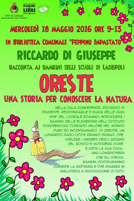 1caaa57552eb7e9b13de29550d3a8817_screenRiceviamo e pubblichiamo – Mercoledì 18 maggio 2016, dalle 9.00 alle 13.00, la Biblioteca Comunale “Peppino Impastato” di Ladispoli presenta il laboratorio naturalistico-ambientale: “Oreste: una storia per conoscere la natura” con Riccardo Di Giuseppe, Direttore delle Oasi WWF di Macchiagrande, Vasche di Maccarese e Bosco Foce dell’Arrone e i bambini delle Elementari degli II.CC. Corrado Melone e Ladispoli 1. Oreste è un lombrico dagli occhi grandi grandi che svelerà ai bimbi i segreti degli abitanti del bosco e mostrerà come è fatta la sua casa, una lombrichiera che gli stessi bambini costruiranno durante il laboratorio e che rimarrà in Biblioteca a disposizione di tutti. L’incontro, inserito nel cartellone nazionale del Maggio dei Libri 2016, come afferma Riccardo Di Giuseppe …fa riferimento ai contenuti etici dell’educazione ambientale, non ridotta a semplice studio dell’ambiente naturale, ma come azione che promuove cambiamenti negli atteggiamenti e nei comportamenti, sia a livello individuale che collettivo