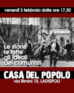 L’iniziativa è organizzata dalla casa del Popolo di Ladispoli, che si sta proponendo, sempre più come un luogo di incontro e di confronto per tutti coloro che nel nostro comprensorio si sentono di sinistra e non vogliono arrendersi al propagandistico e falso concetto di “fine della storia”, tanto propugnato dalle classi e dai poteri dominanti.