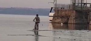 Mentre la sindaca di Roma Virginia Raggi annuncia che le captazioni del lago sono scese di 500 litri al secondo e ai nasoni saranno installati dei rubinetti, i livelli del lago di Bracciano sono ormai scesi notevolmente. Da mesi comitati di cittadini, associazioni e istituzioni ne denunciano i livelli critici. Ma forse ancor più significativo, per rappresentare l’emergenza che sta vivendo il bacino e il suo stato di salute è il video girato da un cittadino e diventato in breve tempo virale su Facebook. Là dove una volta attraccavano i battelli, ora la gente si sposta e gioca in bici. Si cammina sulle acque insomma e lo si fa con una estrema facilità che fa ancor più preoccupare.