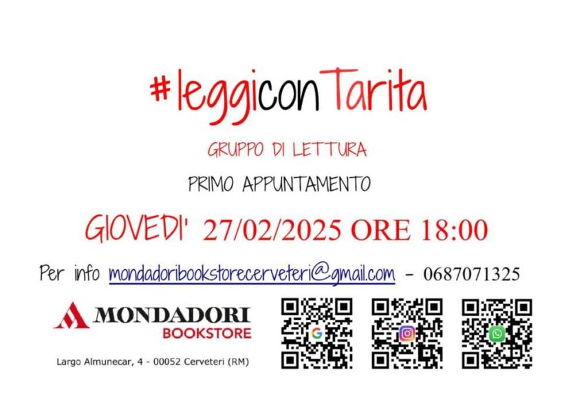 “Leggi con Tarita”, questo il nome dell’iniziativa: sarà proprio una dei due titolari, Tarita Vecchiotti per l’appunto, ad accogliervi nel fantastico mondo dei libri e di Mondadori. Un’occasione per leggere insieme, per conoscere insieme nuove uscite e pubblicazioni letterarie, per conoscere un mondo che solamente leggendo possiamo scoprire. Per informazioni inviare un messaggio Whatsapp al numero 0687081325 oppure inviare una e-mail a mondadoribookstorecerveteri@gmail.com