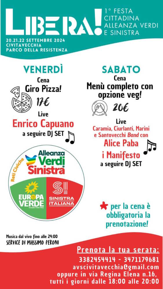 “Libera! Alleanza Verdi Sinistra di Civitavecchia organizza la sua prima festa cittadina, una formazione politica cittadina nata da poco tempo, passata per una appassionante campagna elettorale, ora alle prese con l’amministrazione della città.