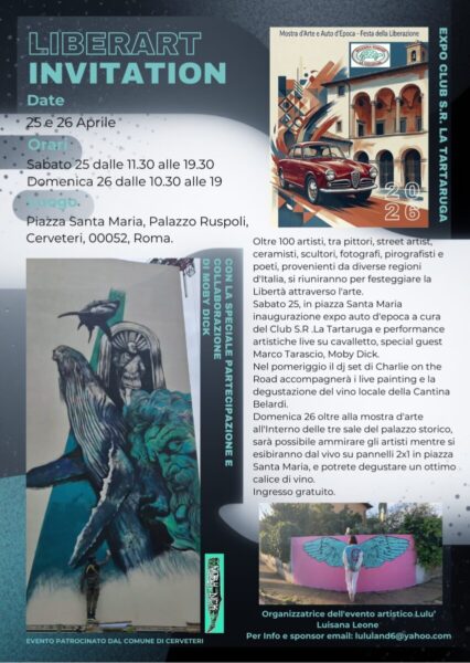 “Non una semplice mostra – ha aggiunto Luisana – che si realizzerà anche grazie alla presenza di numerosi sponsor: tante attività commerciali del territorio che con grande generosità hanno scelto di sostenere ‘LiberArt’. Alle opere, affiancheremo momenti di musica dal vivo con DjSet e l’arrivo, sabato 25 aprile, subito dopo la cerimonia istituzionale al Monumento ai Caduti per la Festa della Liberazione, delle auto d’epoca della Scuderia Romana ‘La Tartaruga’: una presenza davvero di prestigio che sono onorata apra questa manifestazione. Non mancherà neppure la scoperta dei sapori e dei prodotti tipici della terra, con le degustazioni della Cantina Belardi, in programma sia sabato 25 che domenica 26 aprile, dalle ore 16:30 alle ore 18:30”.