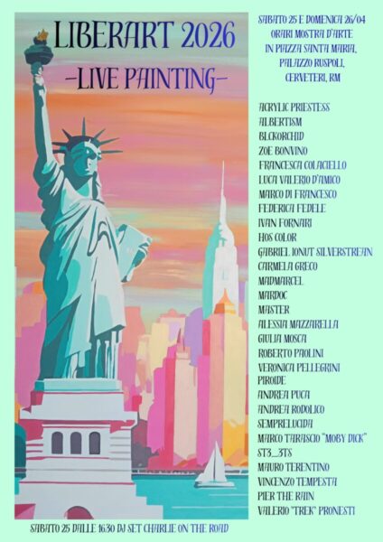 L’arte celebra la Festa della Liberazione. Tutto è pronto a Cerveteri per “LiberArt”, il grande evento che coniugherà pittura, scultura, fotografia, street-art, musica e momenti conviviali nei locali di Sala Ruspoli e in Piazza Santa Maria a Cerveteri. Vernissage dell’evento, organizzato da Luisana “Lulù” Leone, insieme a più di 100artisti e con il Patrocinio dell’Amministrazione comunale, fissato per le ore 11:30 di sabato 25 aprile.