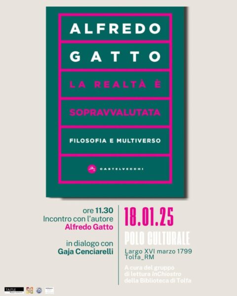Originale appuntamento domenica 18 gennaio, alle ore 11.30, ospitato dalla Biblioteca comunale di Tolfa, nel Polo Culturale, sede del gruppo di lettura “InChiostro” che propone l’incontro con Alfredo Gatto, autore del libro “La realtà è sopravvalutata filosofia e multiverso” (Castelvecchi). Modera la scrittrice Gaja Cenciarelli.