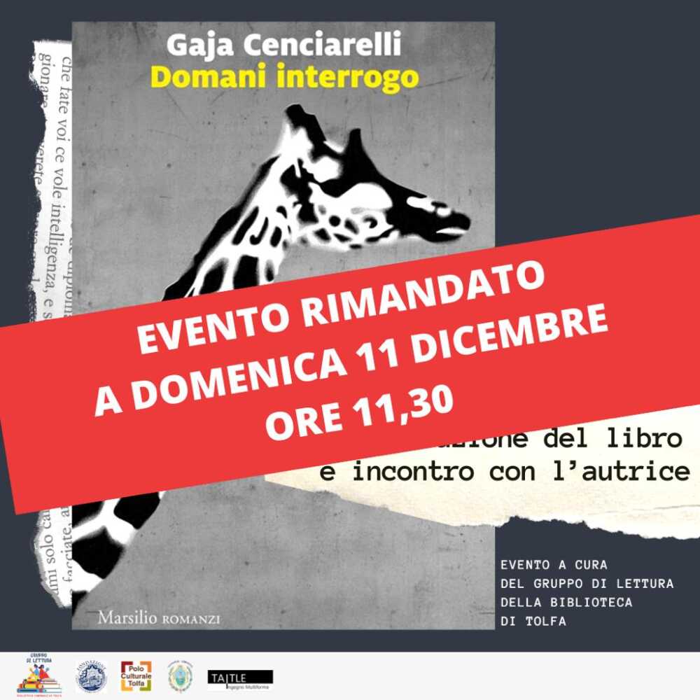 Era tutto pronto per l’incontro con Gaja Cenciarelli, attesa per oggi pomeriggio al Polo culturale di Tolfa per la presentazione del suo libro “Domani interrogo”, (Marsilio), organizzata dal Gruppo di lettura della biblioteca comunale, ma la scrittrice ha avuto un problema imprevisto ed ha dovuto annullare l’impegno.