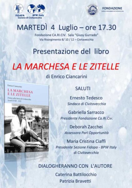 Dopo i saluti istituzionali del Sindaco Avv. Ernesto Tedesco e dell’Assessora alle Pari Opportunità Deborah Zacchei e le introduzioni della Presidente della Fondazione Ca.Ri.Civ Gabriella Sarracco, che ha curato la prefazione e di Maria Cristina Ciaffi Presidente della Sezione FIDAPA di Civitavecchia, saranno le Socie Caterina Battilocchio e Patrizia Bravetti a dialogare con l’autore.