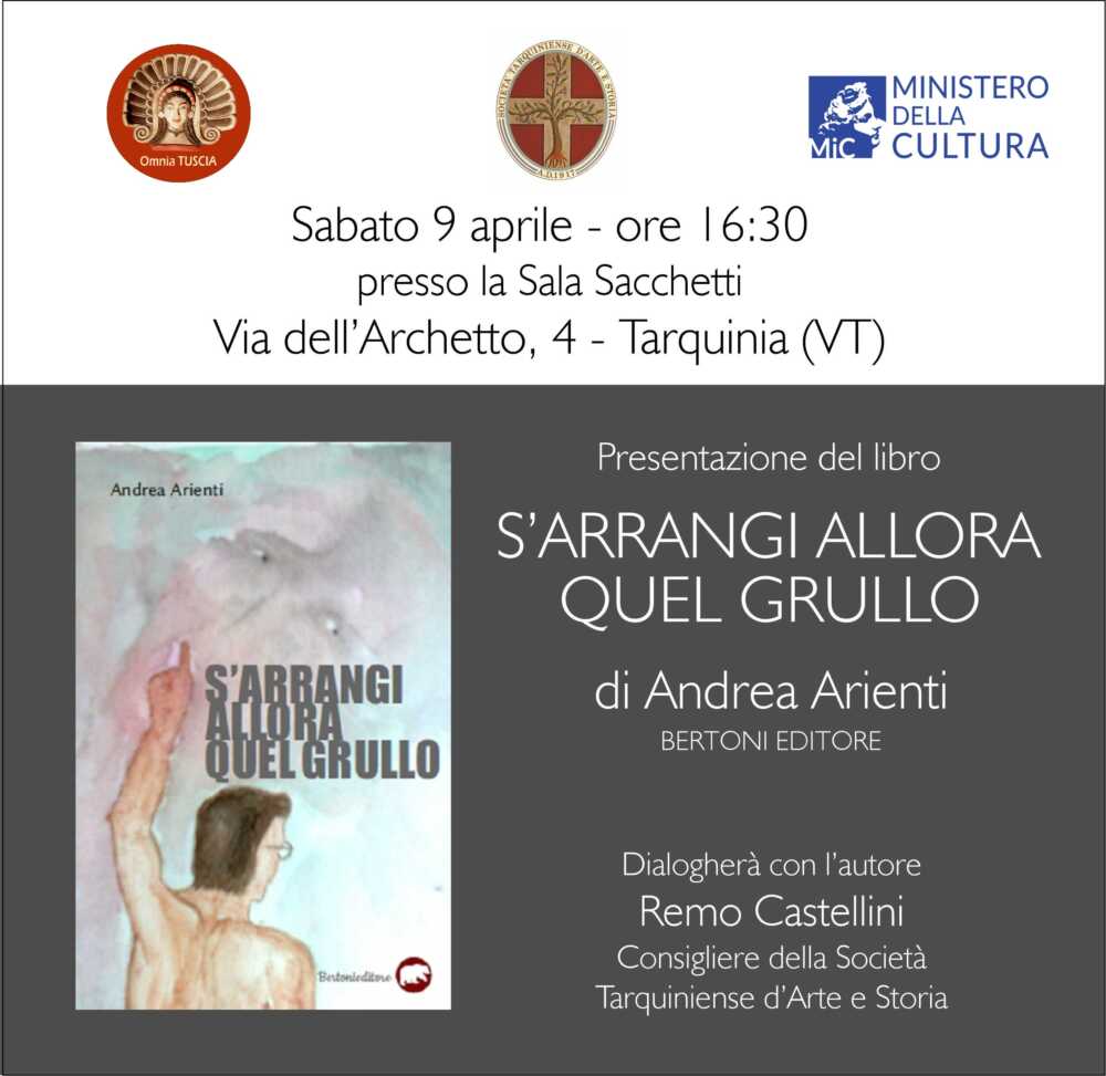 S’arrangi allora quel grullo è il titolo del romanzo di Andrea Arienti, pubblicato da Bertoni editore (2019), che concluderà il ciclo di incontri letterari promosso dalla Società Tarquiniense d’Arte e Storia (STAS) e da Omnia Tuscia, con il patrocinio del Ministero della Cultura (MIC) e in collaborazione con l’IISS “Vincenzo Cardarelli”.