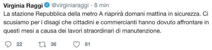 “La stazione Repubblica della metro A riaprirà domani mattina (26 giugno, ndr) in sicurezza”. Questo il tweet di Virginia Raggi.