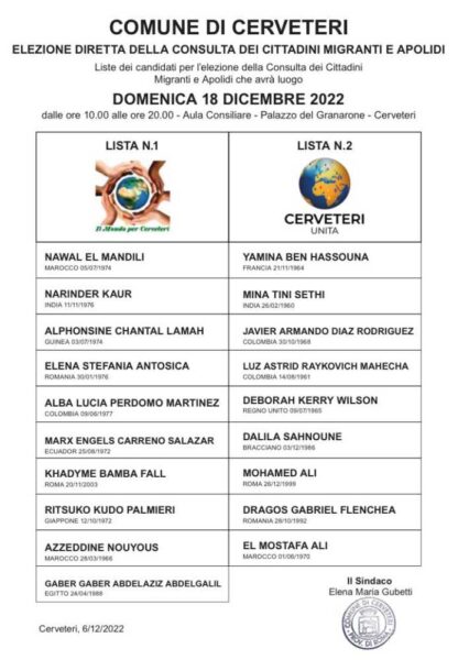 “Giungiamo alla votazione di domenica dopo un lungo percorso molto partecipato –ha dichiarato Elena Gubetti, Sindaco di Cerveteri– nei primi giorni del mese di settembre, infatti, abbiamo iniziato ad incontrare i migranti per spiegare loro quanto possa essere importante avere nella nostra città una Consulta in cui vengano rappresentati tutti i cittadini stranieri della nostra Comunità. Grazie al lavoro di Nawall El Mandilli, Consigliera comunale aggiunta uscente e della Delegata Lucia Lepore, da sempre attiva nel campo del sociale e della cooperazione, si è dato vita ad un gruppo davvero unito e propositivo. La Consulta dei Cittadini Migranti e Apolidi, sin dalla sua costituzione avvenuta nel 2017, è sempre stata estremamente attiva nel nostro Comune, rendendosi protagonista sia in iniziative culturali che in appuntamenti solidali. Per questo, così come avvenuto in questi mesi preparatori, auspico che domenica siano tantissimi i cittadini che parteciperanno alle votazioni e invito tutti coloro che possono votare a esprimere la loro preferenza e a rendere questo strumento di partecipazione veramente vivo e forte. Inclusione e partecipazione sono da sempre i principi che guidano la nostra amministrazione e questo è un altro tassello importante per la crescita della nostra città. Sarà un importante momento di democrazia e integrazione”.