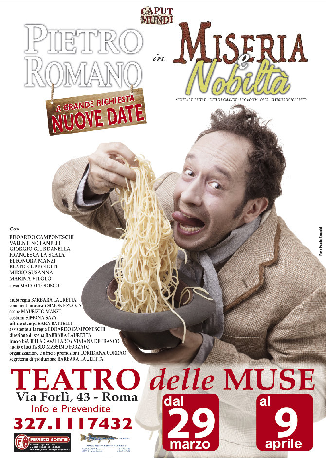 Dopo il grande successo ottenuto a inizio stagione torna a grande richiesta di pubblico “Miseria e nobiltà”, rivisitazione e trasposizione in dialetto romanesco scritta, diretta e interpretata da Pietro Romano, liberamente tratta dall’omonima opera di Eduardo Scarpetta, in replica straordinaria dal 29 marzo al 9 aprile presso il Teatro delle Muse di Roma.