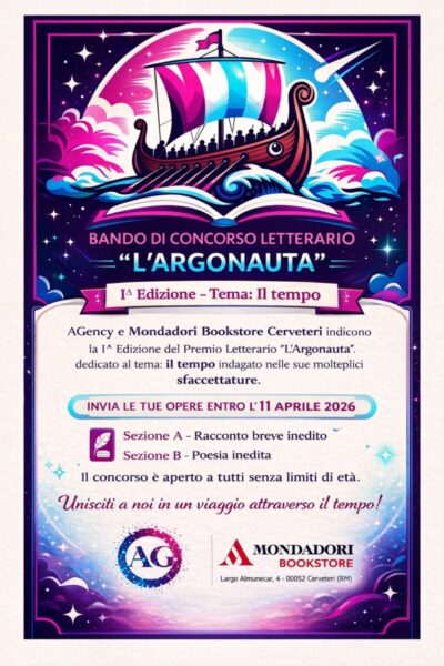 Scrittori e appassionati di letteratura di qualsiasi età, date spazio alla creatività! A Cerveteri, dalla collaborazione tra Agency e la libreria Mondadori Bookstore Cerveteri, nasce la prima edizione del Concorso Letterario “L’Argonauta”, un nuovo viaggio dedicato alla scrittura e a chi ama esplorare, attraverso le parole, ciò che siamo e ciò che diventiamo.