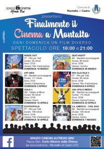 Riceviamo e pubblichiamo – Dal 19 marzo lo “Spazio Cinema Alfredo Bini” si trasforma in sala proiezioni. All’ex bocciodromo di piazza Carlo Alberto dalla Chiesa sarà possibile vedere, ogni domenica, le seconde visioni dei film nelle due fasce orarie: 18-21. L’iniziativa, in collaborazione con il Comune di Montalto di Castro, vede al momento una programmazione fino al 7 maggio 2017.