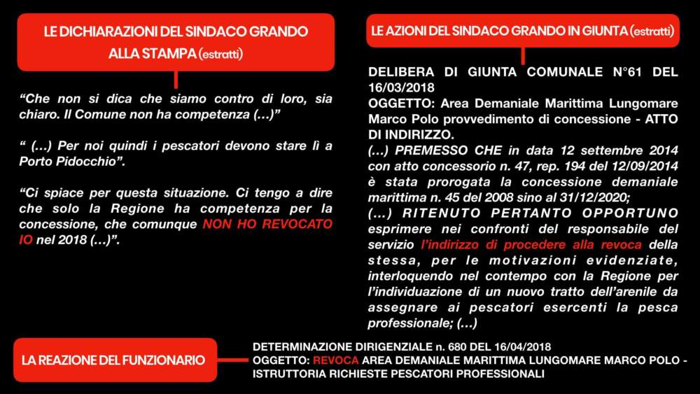 Così, dopo giorni di fiction, con tanto di dichiarazioni e video (diffusi ad arte) salta fuori che, non solo l’amministrazione Grando aveva chiesto al funzionario di pubblicare la determina di revoca della concessione demaniale su Porto Pidocchio ma che, per farlo a regola d’arte, aveva anticipato l’azione del funzionario con una delibera di giunta, la numero 61 del 16 marzo 2018. Presenti cinque assessori su sette, tutti ben consapevoli di quello che andavano a fare (almeno crediamo).