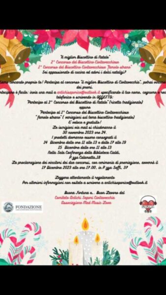 Torna anche quest’anno il concorso “Il Miglior biscottino di Natale”, organizzato dal Comitato Antichi Sapori Civitavecchia, l’associazione Mad Music Love e il supporto della Fondazione Cariciv.