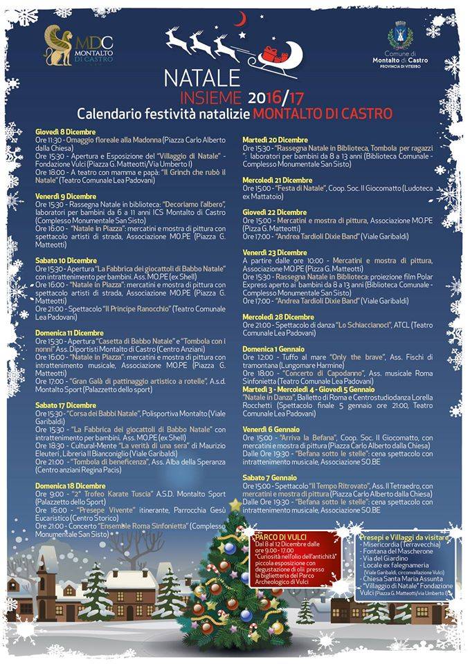 Domenica 11 dicembre, dalle ore 15:30, presso il Centro Anziani, l’apertura della “Casetta di Babbo Natale” e il via alla “Tombola con i nonni”, con l’associazione Diportisti di Montalto di Castro. Alle ore 16 riaprono i mercatini e la mostra con l’intrattenimento musicale a piazza G. Matteotti. Alle ore 17, il “Gran Galà di pattinaggio artistico a rotelle” dell’Asd Montalto Sport presso il palazzetto dello sport. A Pescia Romana, alle ore 15, “Natale con la Fratres” con l’allestimento degli alberi e lo spettacolo “Il Mago di Oz” (Piazza delle Mimose) a cura dell’associazione Il Tetraedro.