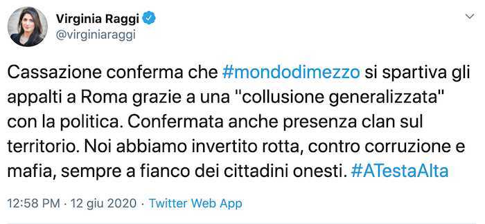 Virginia Raggi, sindaca di Roma, ha così commentato su Twitter: “Cassazione conferma che Mondo di Mezzo si spartiva gli appalti a Roma grazie a una “collusione generalizzata” con la politica. Confermata anche presenza clan sul territorio. Noi abbiamo invertito rotta, contro corruzione e mafia, sempre a fianco dei cittadini onesti”
