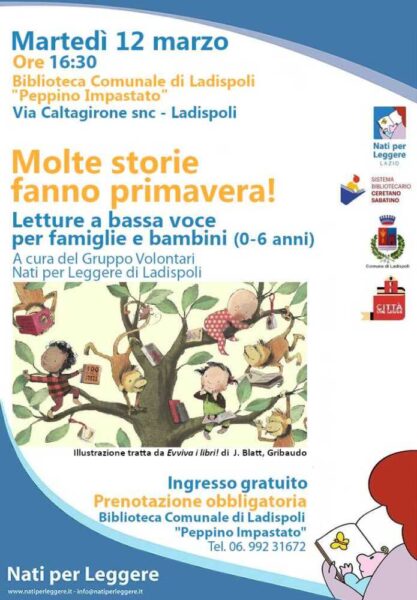 Entrambi gli incontri sono a cura del nostro instancabile e prezioso Gruppo Volontari Nati per Leggere di Ladispoli, che tanto si impegna per promuovere la lettura in famiglia ai bambini fin dalla nascita.