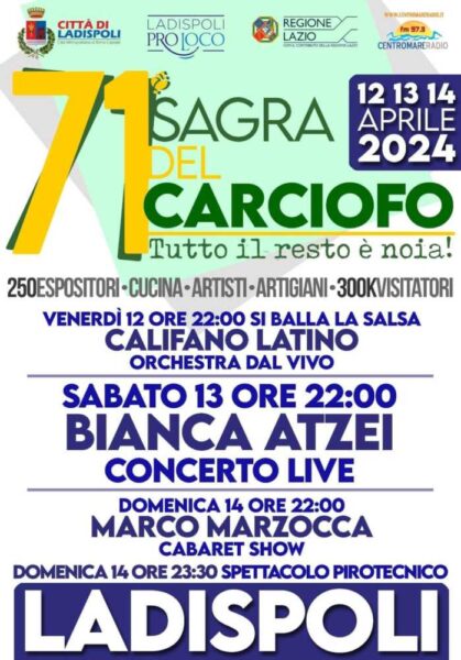 Ore 14:30 Allievi scuola Koinet Teatrando “Non è un carciofo” Ore 16:00 l’area della sagra sarà allietata dalla musica di: BANDA MUSICALE CITTA’ DI LADISPOLI “LA FERROSA” BANDA MUSICALE “S. CECILIA” BANDA MUSICALE “GIUSEPPE VERDI” DI CASTELCHIODATO