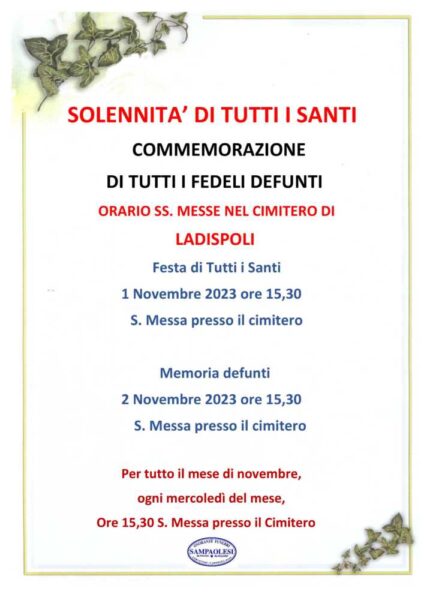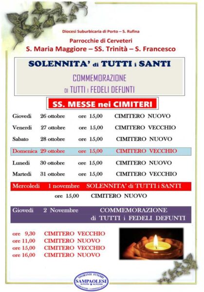 Ecco un breve schema realizzato dalle Onoranze Funebri Sampaolesi relativamente gli orari delle celebrazioni della Santa Messa nei Cimiteri comunali di Cerveteri e Ladispoli