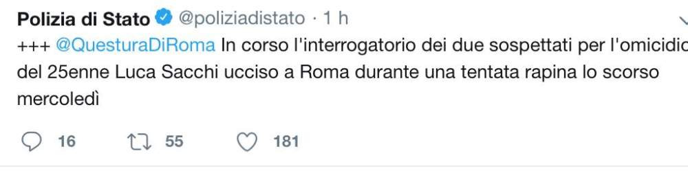 Due romani, due 21enni, si trovano negli uffici della Squadre Mobile – alla presenza del magistrato, di Polizia e carabinieri – in relazione all’omicidio di Luca Sacchi, il giovane di 24 anni che nella serata di mercoledì 23 ottobre si è opposto al tentativo di furto dello zaino, subito dalla fidanzata e che è stato ferito da un colpo di pistola, nella zona della Caffarella. Tra le piste seguite, al momento, c’è anche quella di uno scambio di droga finito male.