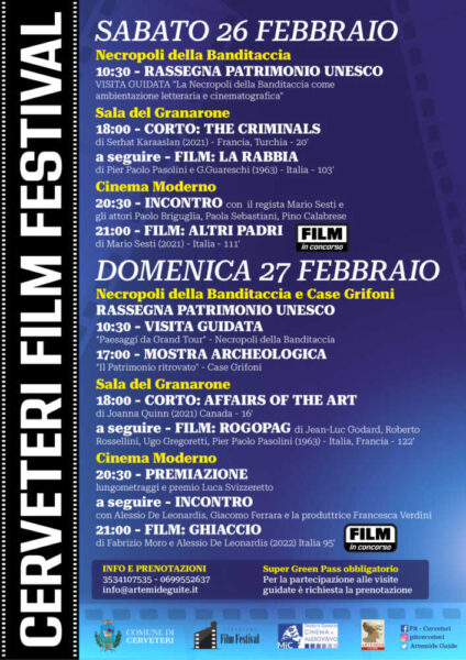 La rassegna è finanziata dal MIBAC – Direzione Generale Cinema Audiovisivo e dal Comune di Cerveteri. Tutte le proiezioni sono ad ingresso gratuito. Nel pieno rispetto delle vigenti normative anti-covid, obbligatorio essere in possesso del Green Pass Rafforzato e indossare la mascherina protettiva durante l’intera durata della proiezione.