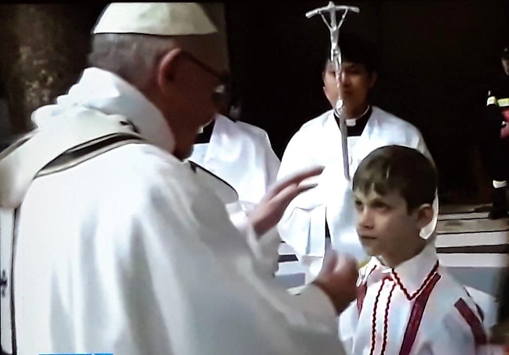Ma le sorprese non sono finite! Uno dei bambini presenti alla festa ha avuto modo di incontrare, qualche giorno dopo, papa Francesco partecipando alla Processione della Vigilia in Vaticano. Infatti alla processione sono stati invitati 12 bambini, di 6 Paesi del mondo, di cui 2 romeni, una ragazzina che abita a Roma e Cristian Rafael Dumea di Ladispoli, che frequenta la terza primaria presso la “Ilaria Alpi”, insieme alla sorella Alessandra. I bambini sono andati, insieme al Sommo Pontefice che portava il Bambino Gesù, verso la mangiatoia allestita nell’impressionante altare della Basilica di San Pietro. Insieme a 30 cardinali e 40 vescovi, hanno così ricordato la nascita del Santo Bambino nella stalla del Betlemme in Giudea più di 2000 anni fa. Cristian Rafael Dumea, 8 anni, è stato così benedetto dal Papa nella notte della Vigilia.