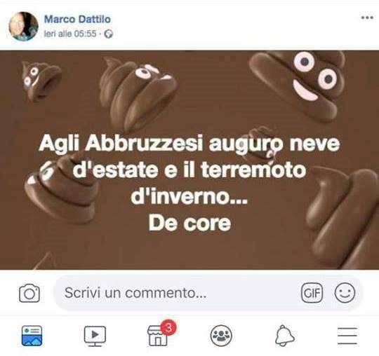 Il sottoscritto, deluso dai risultati delle elezioni in merito, si è dichiaratamente sfogato scrivendo ciò che pensava, prendendosi tutte le responsabilità, sicuro di aver subito un’ingiustizia quale quella di vedere, ancora una volta su delle poltrone importanti, soggetti provenienti da partiti che hanno in passato, e di recente, devastato quel territorio, ne ricordo alcuni: Berlusconi; soldi a cosa nostra tramite Dell’Utri anche da premier e dopo le stragi (Corte d’Assise di Palermo). Marsilio; sponsorizzato da Alemanno e dalla Meloni, si quella di Ruby nipote di Mubarak. Salvini; una cosa sola, su lui invito tutti a vedere la puntata di Report del 10 dicembre u.s.. Viceversa a questo, il sottoscritto rammenta gli interventi oggettivi, in denaro ed altro, che il m5s ha elargito in aiuto a tale popolazione nei momenti difficili.