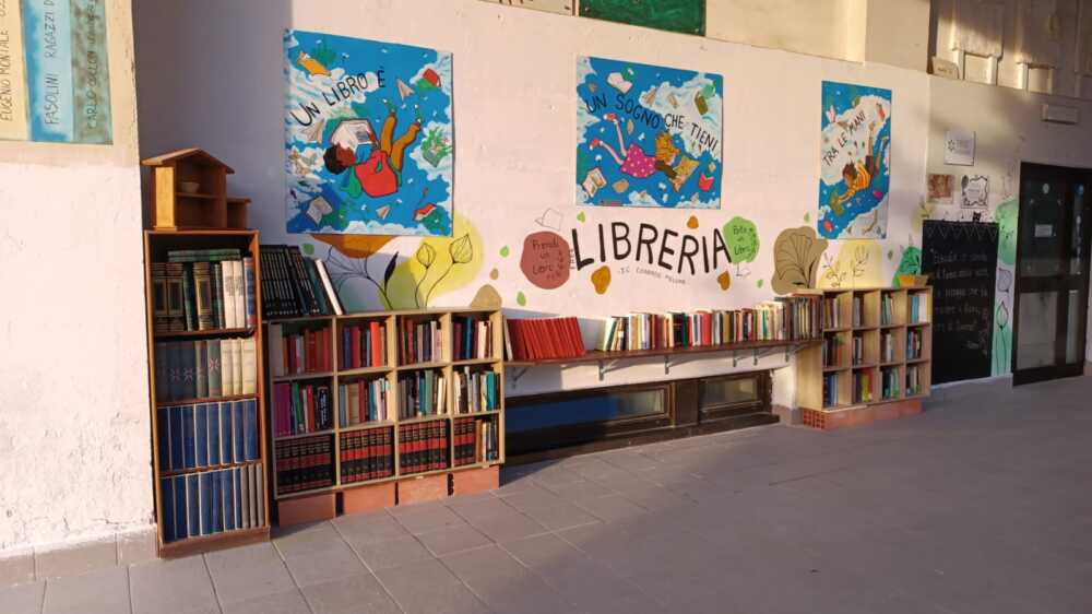 Ma un ambiente grigio e noioso non stimola la fantasia e la gioia, per cui proseguiranno le attività decorative delle aule, con l’aiuto dei genitori che vogliano mettersi in gioco con le classi dei propri figli, ma anche gli spazi comuni saranno resi più belli. Dopo il posizionamento della scultura “1022” di Fabrizio Pompili e di un salvagente proveniente da Lampedusa (donato dalla Caritas) che invita con il suo esempio a salvare vite umane, le decorazioni di Sonia Perticara, i personaggi disneyani delle pareti interne viciniori alle aule dei più piccoli (opere di Caterina Farina), la presenza nelle aule di dipinti di Guido Venanzoni, l’esposizione delle splendide tele descriventi il mare donate da Anna Tonelli ed i murales di Vincenza Conti, Nadia Cesarini, Monica Marra, Tiziana Rinaldi Giacometti, Daniele Bartocci, Carlo Gori, Burla Manu, Mosa One, Andrea Puca, Antonella Pirozzi, C0110, Lac68, Dreamplus, Uman, sarà la volta di un altro famoso street artist, Maupal, che realizzerà un murale alto oltre 15 metri all’interno della Scuola, grazie al fondamentale supporto economico di Luca Quintavalle. Tuttavia già chi entra dall’ingresso principale della Scuola può vedere il lavoro della famiglia Ferri-Perticara che ha organizzato l’accoglienza dei “libri da rubare”: una biblioteca “aperta” dove possono essere prelevati gratuitamente (o anche donati) libri per i ragazzi ed i loro genitori, come invito fattivo alla lettura.