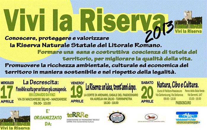 Per stimolare una seria presa di coscienza del valore delle aree litoranee protette e per riuscire a orientare le scelte politiche abbiamo organizzato Vivi la Riserva: tre giorni di incontri, dibattiti, pulizia della spiaggia, visite guidate sulle dune, momenti conviviali e di festa.
