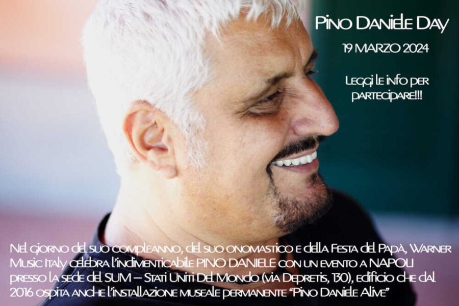 Nel giorno del suo compleanno, del suo onomastico e della Festa del Papà, Warner Music Italy celebra l’indimenticabile PINO DANIELE con un evento a NAPOLI presso la sede del SUM – Stati Uniti Del Mondo (via Depretis, 130), edificio che dal 2016 ospita anche l’installazione museale permanente “Pino Daniele Alive”.