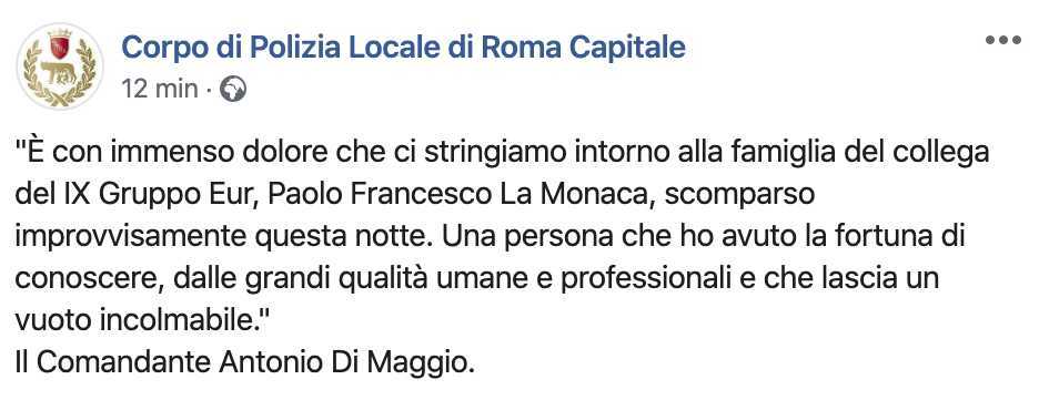 “È con immenso dolore che ci stringiamo intorno alla famiglia del collega del IX Gruppo Eur, Paolo Francesco La Monaca, scomparso improvvisamente questa notte. Una persona che ho avuto la fortuna di conoscere, dalle grandi qualità umane e professionali e che lascia un vuoto incolmabile”,