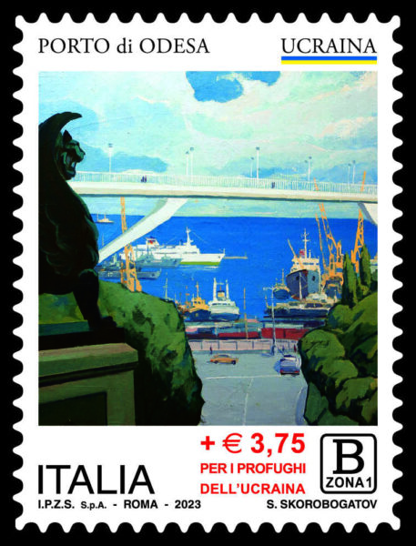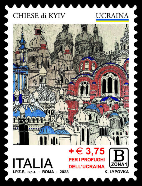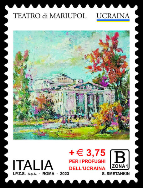 Completano il francobollo le legende “CHIESE DI KYIV”, “TEATRO DI MARIUPOL”, “ PIAZZA DI LVIV”, “PORTO DI ODESA” la scritta “ITALIA”, + “€ 3,75 PER I PROFUGHI DELL’UCRAINA” e l’indicazione tariffaria “ “B zona 1”.