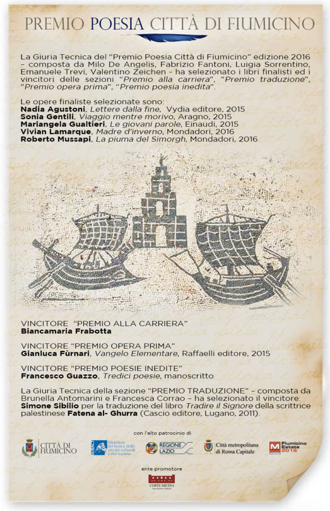 Riceviamo e pubblichiamo – Il prossimo 1° luglio 2016, dalle ore 16.30 alle ore 18.00, alla Biblioteca Nazionale Centrale di Roma – Via Castro Pretorio 105 , si terrà la presentazione della cinquina degli autori finalisti e dei premiati nelle altre sezioni del “Premio Poesia Città di Fiumicino” edizione 2016.