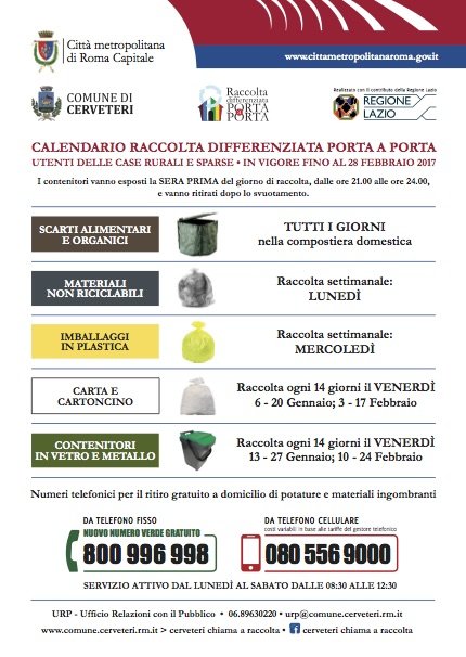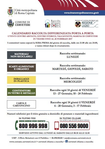 Sul sito internet www.comune.cerveteri.rm.it (sezione Cerveteri chiama a raccolta) sono sempre disponibili gli aggiornamenti sui servizi di raccolta dei rifiuti e di igiene ambientale attivi nel Comune di Cerveteri: raccolta oli vegetali, raccolta ingombranti e potature, contatti utili, segnalazioni, ecc.