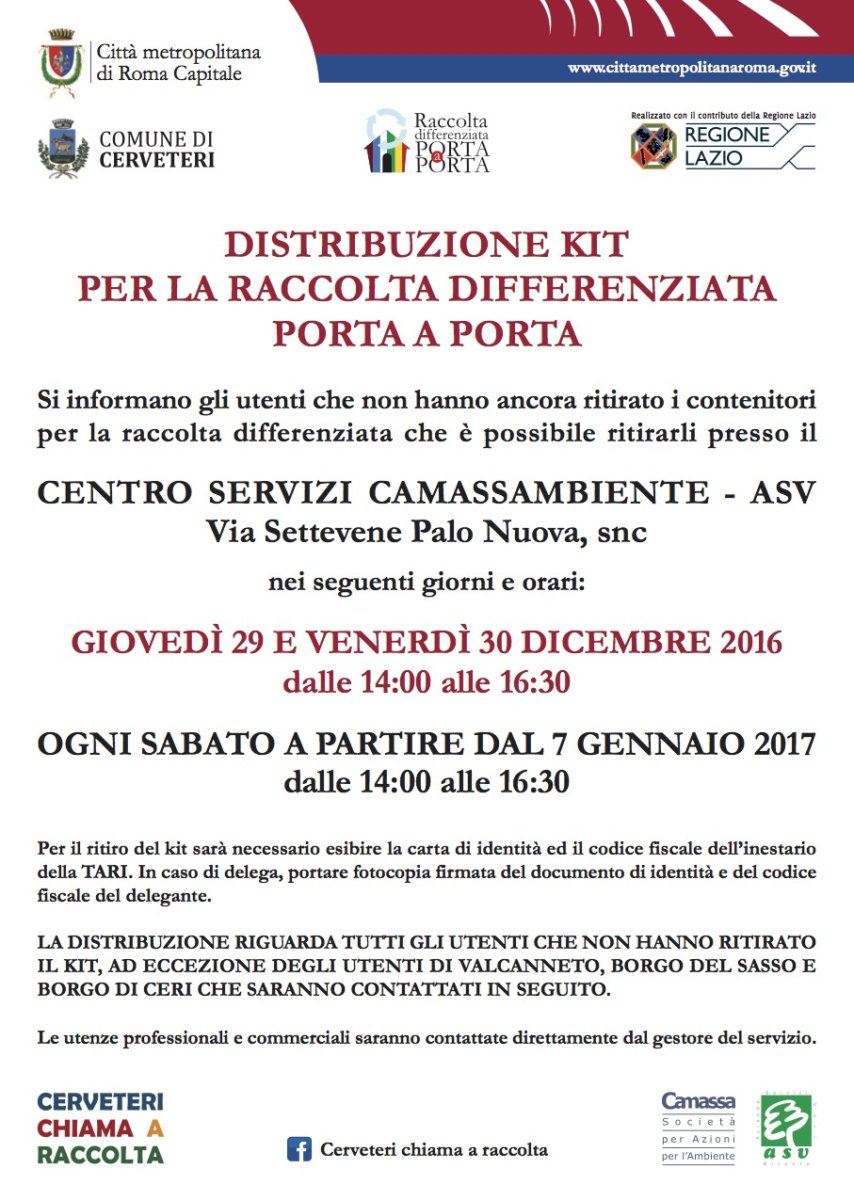 Gli utenti che non hanno ancora ritirato il kit per la raccolta porta a porta potranno farlo tutti i Sabato dalle 14.00 alle 16.30 presso il Centro Servizi di via Settevene Palo Nuova. Gli utenti di Valcanneto e dei centri urbani del Borgo del Sasso e del Borgo di Ceri possono invece attendere per il ritiro del kit prossime comunicazioni.
