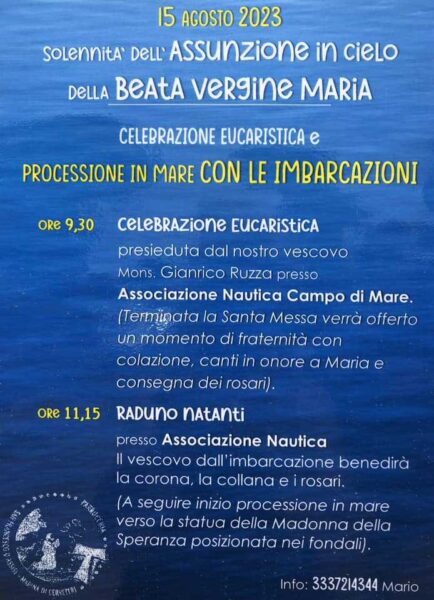 Dalle proiezioni cinematografiche alla consueta processione, fino alla tradizionale messa in spiaggia il giorno di Ferragosto con la processione in mare. Presenzierà tra gli altri, il Vescovo Ruzza.