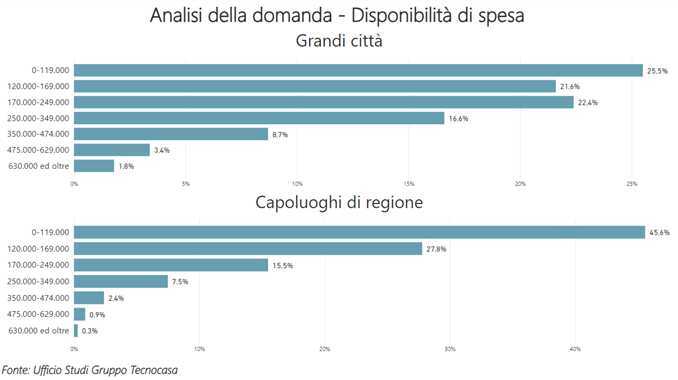 Nei capoluoghi di regione che non sono grandi città il 45,6% dei potenziali acquirenti dichiara di avere una disponibilità di spesa inferiore a 119mila euro. La percentuale cresce rispetto a luglio 2023, quando era pari al 44,3%. La percentuale più elevata di richieste nella fascia di spesa più bassa si riscontrano a Campobasso (79,7%) e a Perugia (74,7%).