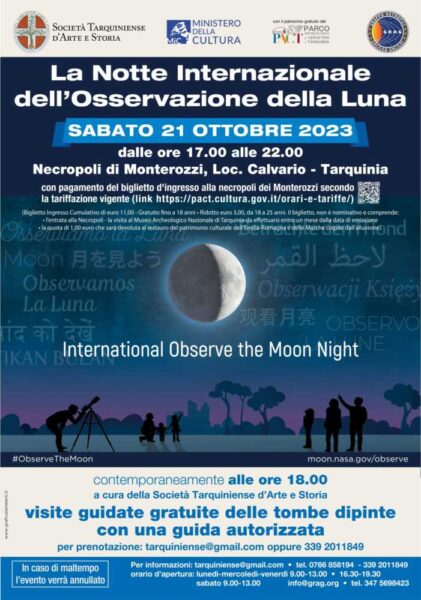 A Tarquinia l’osservazione avverrà dalle 17 alle 22 in un luogo di eccezionale valore storico e artistico: il sito Unesco della necropoli dei Monterozzi, custode delle tombe dipinte etrusche, principali testimonianze della coeva pittura antica. Hanno aderito alla manifestazione promossa dalla NASA la Società Tarquiniense d’Arte e Storia e il Gruppo Astrofili “Galileo Galilei” (GRAG), con la collaborazione del Parco Archeologico di Cerveteri e Tarquinia (PACT) e il patrocinio del Ministero della Cultura: una preziosa sinergia che darà vita a un evento in cui si fondono storia, arte e scienza, per festeggiare il satellite naturale della Terra.