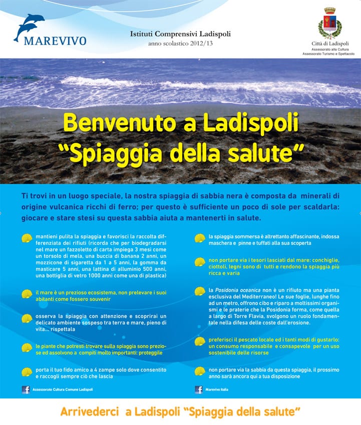 Il decalogo, che sarà distribuito dagli studenti il 28 maggio a tutti gli stabilimenti balneari e hotel, suggerisce buone pratiche da seguire per la salvaguardia ed un utilizzo responsabile della spiaggia nel rispetto delle generazioni future, ricordando che, una volta scomparsa una risorsa, essa è perduta per sempre. L’iniziativa rientra in “Ladispoli spiaggia della salute” organizzato da Marevivo in collaborazione con gli assessorati alla Cultura e al Turismo del Comune di Ladispoli .