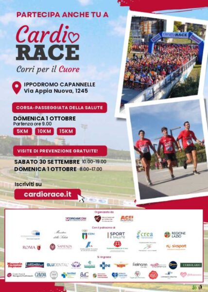 Roma, 26 settembre – Check-up di prevenzione cardiovascolare con elettrocardiogramma ed ecocardiogramma; trattamenti osteopatici, massaggi fisioterapici; controllo della vista e dell’udito; consulenze nutrizionali e psicologiche; screening gratuiti di prevenzione oncologica per tumori cutanei; controlli di prevenzione per il tumore al seno. E ancora: convegno su alimentazione, sport e salute del cuore, lezioni di nutrizionisti, classi di pilates e yoga con esperti del settore e corsi di pronto soccorso e disostruzione delle vie aree nel lattante, adolescente e adulto. Infine, le gare podistiche per tutte le categorie: 14,980 km (competitiva e non), 10,060 km (competitiva e non), 5,240 km (passeggiata o corsa amatoriale), Kids Run (1 km), corsa amatoriale per bambini e ragazzi. Sabato 30 settembre e domenica 1° ottobre, nella celebre location dell’Ippodromo “Capannelle” di Roma, torna CardioRace, la manifestazione per la sensibilizzazione alla salute del cuore organizzata sotto l’egida dell’INRC, Istituto Nazionale per le Ricerche Cardiovascolari. CardioRace rientra tra gli eventi organizzati in occasione della Giornata mondiale del cuore, che si celebra ogni anno il giorno 29 settembre. L’organizzazione generale è della DreamCom, società leader nella comunicazione e nell’organizzazione di eventi nel settore salute. L’organizzazione tecnica delle gare podistiche è affidata all’Associazione sportiva ACSI Italia Atletica. L’evento, giunto alla VII edizione, vede la partecipazione di numerosi enti pubblici e privati coinvolti nell’erogazione di servizi di consulenza gratuita ai visitatori (per ulteriori informazioni www.cardiorace.it).